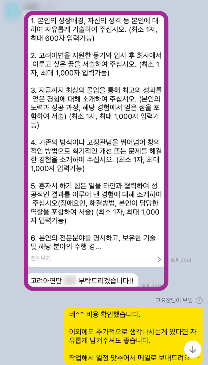 저의 컨설팅은 지원자분과의 **긴밀한 소통**을 바탕으로 진행됩니다. 단순히 글을 대신 써주는 것을 넘어, 지원자분의 강점을 최대한으로 끌어내는 과정이죠. ✨