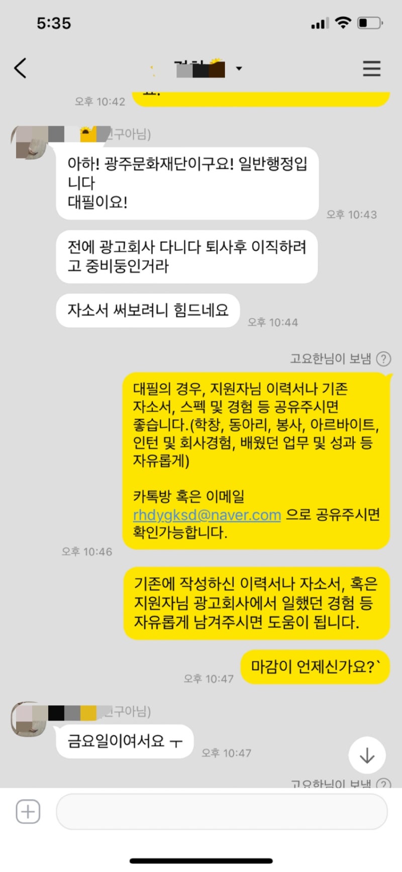 이번 광주문화재단 일반행정 직무에 지원하신 분은 평소 문화예술 분야에 대한 깊은 애정과 공공기관에서 일하고 싶다는 확고한 목표를 가지고 계셨습니다. 특히, 대학 재학 시절부터 다양한 문화예술 관련 행사 참여 및 봉사활동 경험이 있었지만, 이를 자기소개서에 재단의 인재상 및 직무 역량과 연결하여 효과적으로 풀어내는 데 어려움을 느끼고 계셨죠. 제한된 글자 수 안에 본인의 강점과 경험을 명확하고 설득력 있게 담아내어 서류 합격이라는 첫 관문을 넘고 싶어 하셨습니다. 제가 매년 광주문화재단 합격 사례를 만들어냈다는 소식을 듣고 저를 찾아주셨습니다. 😊