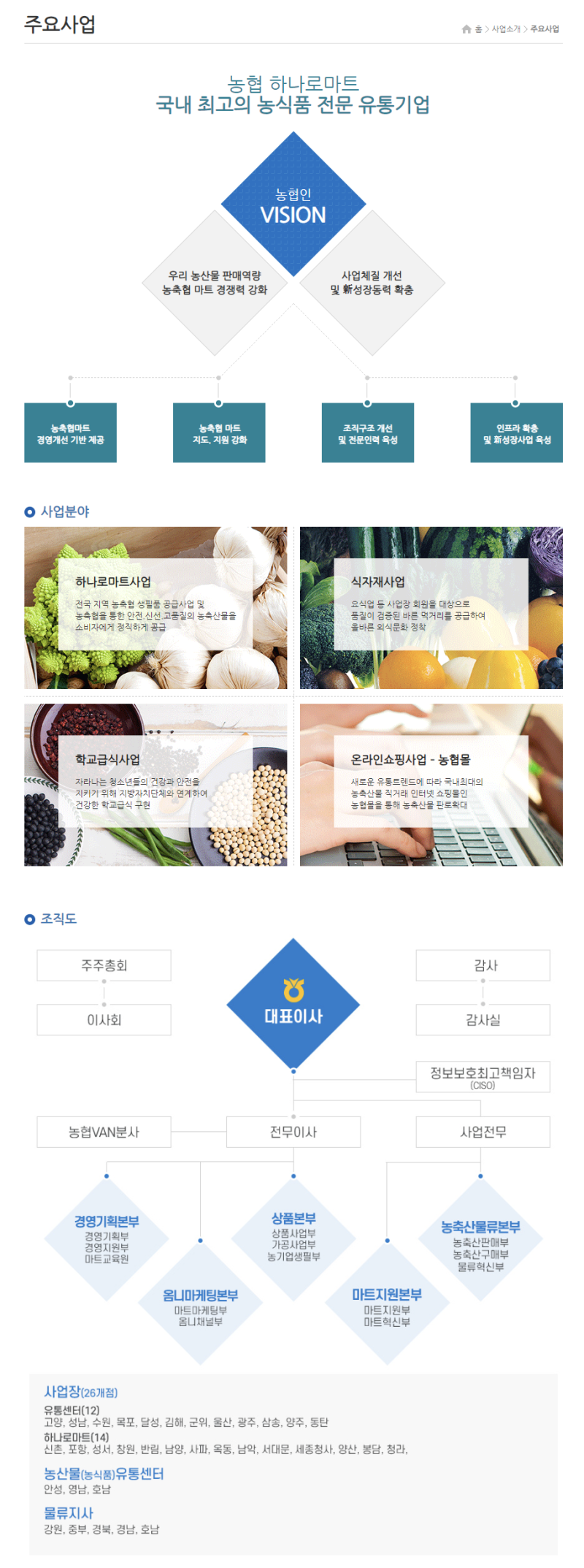 - 주요 사업: 농산물 유통, 하나로마트 운영, 온라인 쇼핑몰 운영, PB 상품 개발