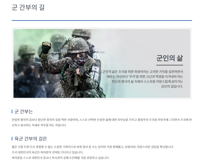 - ✨ 비전: 강력한 전투력과 선진 병영 문화를 선도하는 ‘국민에게 신뢰받는 정예 부사관’