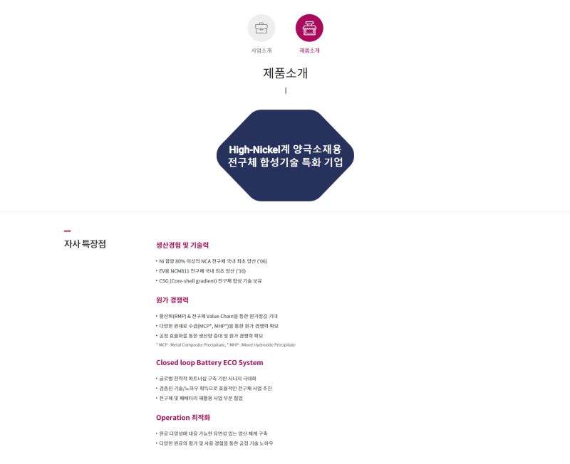 • ✔️ 비전: ‘Global No.1 Eco-Friendly Secondary Battery Material Company’ – 2차전지 소재 산업의 글로벌 리더로서 지속 가능한 성장을 추구합니다.