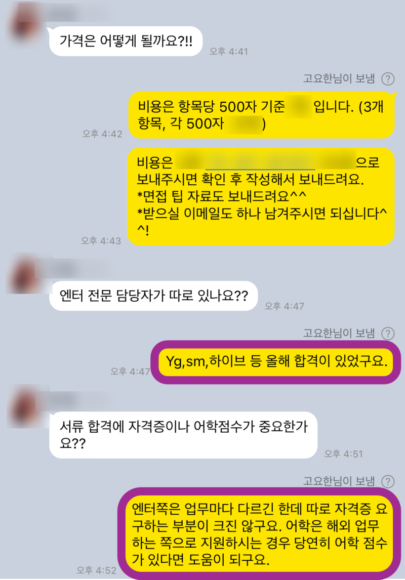 저는 지난 몇 년간 수백 건의 대기업, 공기업, 그리고 YG와 같은 경쟁력 있는 엔터테인먼트 기업의 채용 컨설팅을 진행하며 수많은 합격 사례를 만들어왔습니다. 단순히 글쓰기 기술을 넘어, 지원자님의 잠재력을 최대한 끌어내고 기업이 원하는 인재상에 부합하도록 맞춤형 전략을 제시해 드립니다.