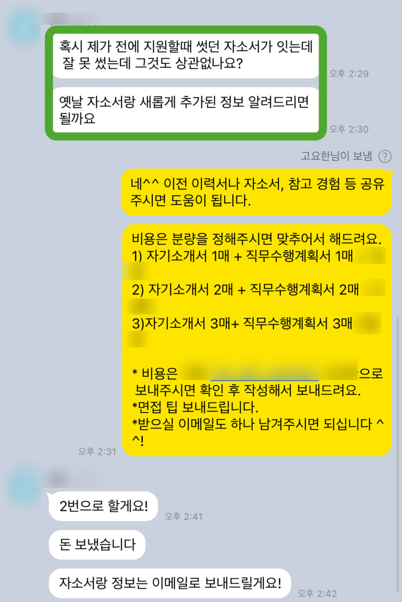 4. 자기소개서 작성/첨삭/대필 진행: