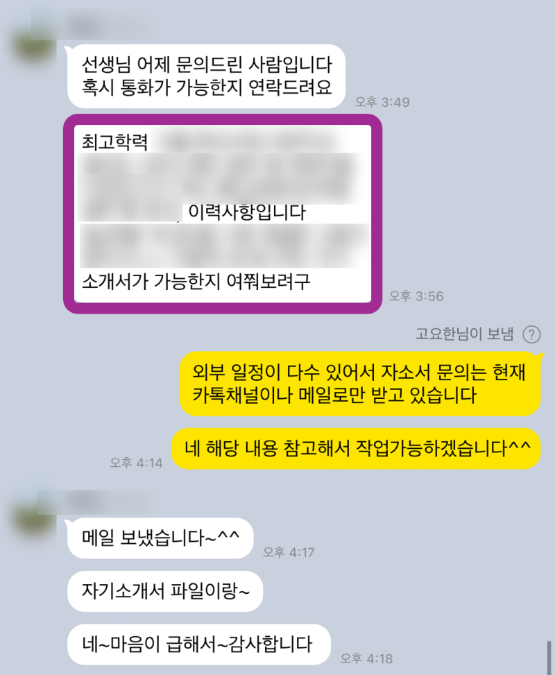 - 자기소개서 대필: 자소서 작성이 어려운 분들을 위해 맞춤형 자소서를 대필해드립니다.