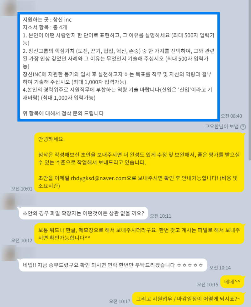 지원 전 이력서 및 자소서 분석 1:1 심층 상담 (경험/역량 파악) 창신inc 기업 분석 및 직무 이해 문항별 맞춤 전략 수립 초안 작성 및 첨삭 (수차례 반복) 최종 검토 및 완성