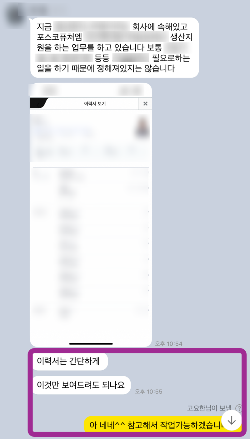 >> 이력서 및 초안 자료 공유: 지원자님의 경험과 강점을 파악하기 위한 기초 자료 전달