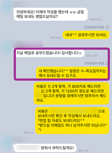 지원자님의 의견을 반영하여 수정을 진행하고, 최종적으로 완성도 높은 결과물을 만듭니다. (2차 n차 검토)