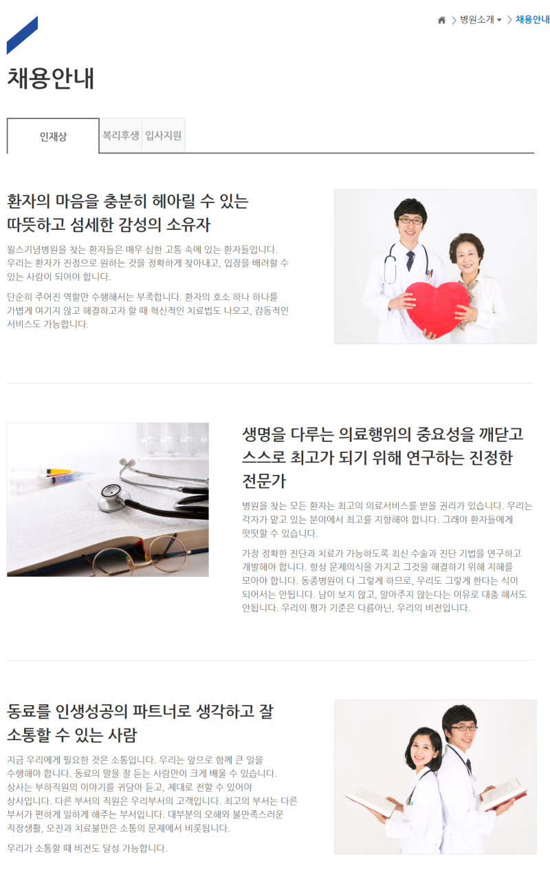 • 인재상: 따뜻한 마음을 가진 간호인, 책임감과 성실성을 갖춘 인재, 끊임없이 배우고 성장하는 전문가, 협력과 소통으로 시너지를 내는 사람